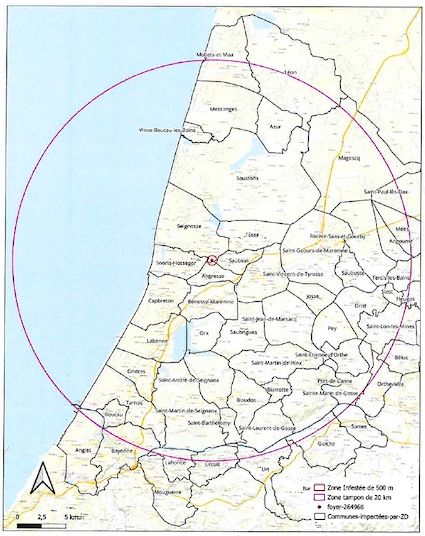Sont concernées toutes les communes se trouvant dans une circonférence allant de Moliets-er-Maa, au Nord à Anglet au Sud, en passant par : Léon, Magescq, Saint-Paul-lès-Dax, Mèes, Tercis, Heugas, Saint-Lon-les-Mines, Orthevielle, Saint-Marie de Gosse, Sames, Guiche, Urt, Urcuit, Lahonce, Bayonne et Anglet