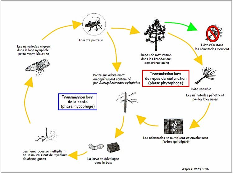 Les petits vers transparents mesurent moins d’un millimètre et sont capables de tuer un pin adulte en quelques semaines. Ils sont transportés par un insecte longicorne, le Monochamus