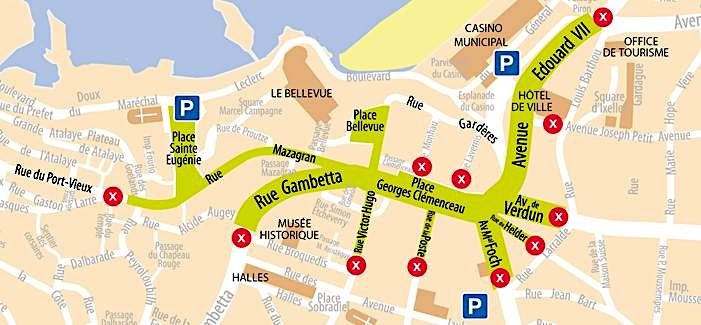Le stationnement sera interdit de 5h à 20h30 : place Clemenceau, rue de La Poste (de la place Clemenceau au parking), rue Mazagran (de la place Clemenceau à la rue Peyroloubilh), rue Gambetta (de la place Clemenceau à la rue Augey), avenue de Verdun (de la rue Barthou à la place Clemenceau), rue Victor Hugo (de la rue Broquedis à la place Clemenceau), avenue Foch (de de la place Clemenceau à la rue Larralde), rue du Helder (de la place Clemenceau à la rue Larralde), avenue Edouard VII (de la place Clemenceau à l’avenue de la Marne), avenue Guy Petit (entre le commissariat et la mairie).