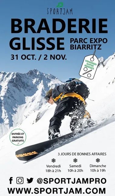 Cet événement s’adresse aux passionnés de glisse et d’adrénaline : surf, ski, snow, skate, bike… avec un large choix de planches, de combinaisons néoprène, de protections, de casques, de masques, de vêtements techniques et d’accessoires à prix mini.