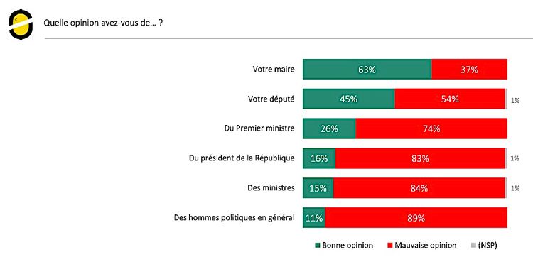 Près des deux-tiers des Français ont donc une bonne opinion de leur maire alors qu’ils sont une large majorité à en avoir une mauvaise de tous les autres politiques. Le maire est ainsi 4 fois plus populaire que le président de la République (16%) et que les hommes politiques en général (11%).