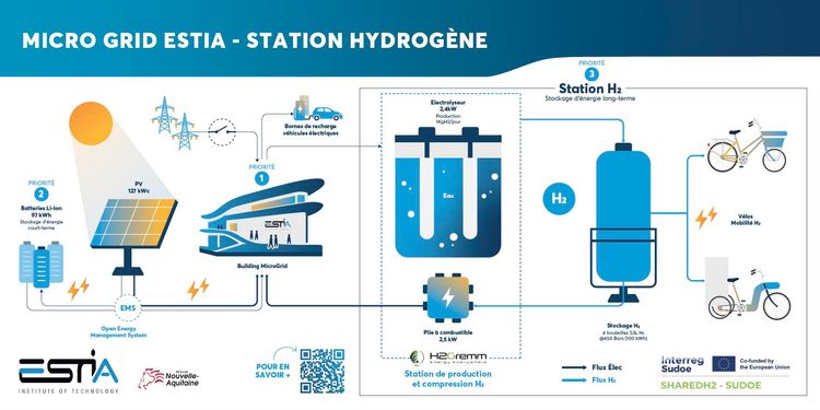 Cette station n’est pas qu’une vitrine technologique, c’est un démonstrateur grandeur nature. Conçue dans le cadre du projet européen SharedH2 (Interreg SUDOE), elle résulte d’une collaboration entre l’ESTIA, H2GREMM et plusieurs partenaires académiques européens, avec le soutien du pôle de compétitivité SmartPower, spécialisé dans la gestion de l’énergie.