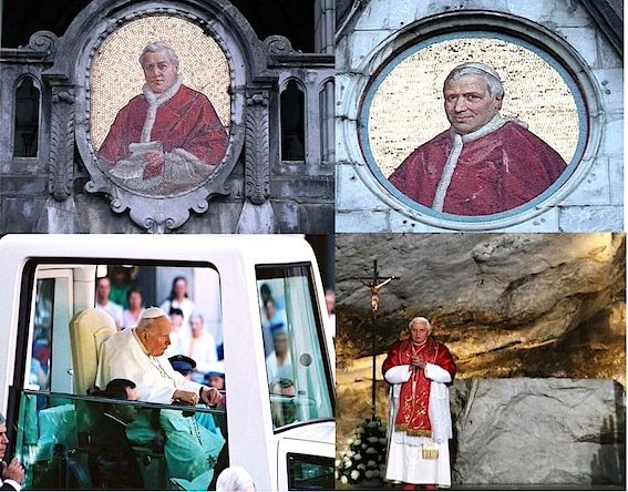 En plus de la double visite de Jean-Paul II, Benoît XVI est venu en 2008 célébrer le 150e anniversaire des apparitions. Quant au cardinal Angelo Roncalli, il a fait un pèlerinage à Lourdes avant de devenir le pape Jean XXIII, quand il était nonce apostolique à Paris. Il était venu consacrer la basilique Saint Pie X.