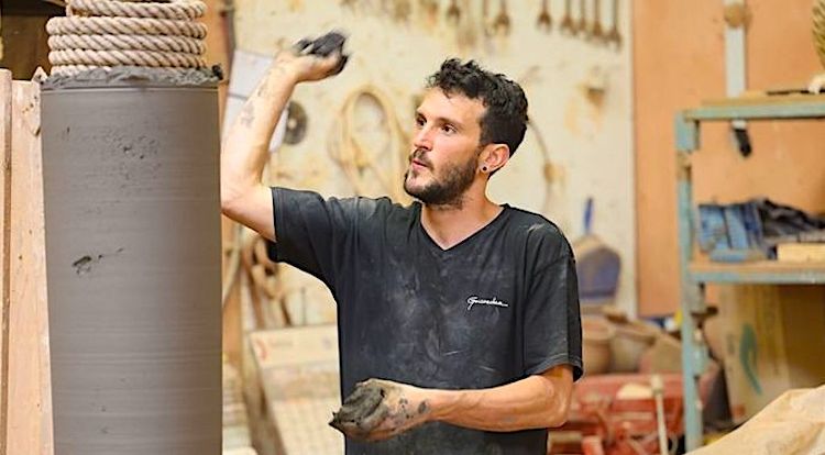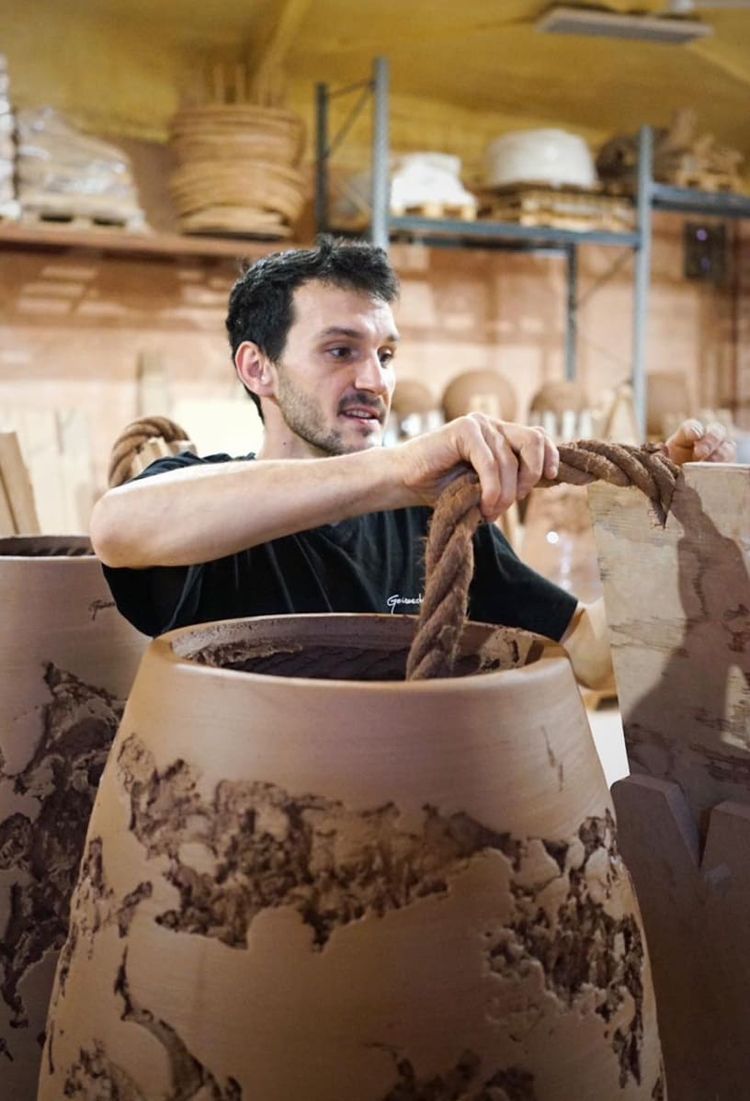 Concassage, tamisage, mélange avec la chamotte, extrusion… Chaque étape compte. Chaque étape conditionne la suite. Jusqu’au façonnage, où différentes techniques coexistent : estampage, calibrage, tournage, ou encore la spectaculaire technique de la corde pour les grandes pièces. « On s’appuie sur des techniques anciennes, mais on les adapte. On les fait évoluer à notre façon », explique Maitena.