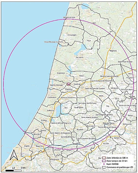 Sont concernées toutes les communes se trouvant dans une circonférence allant de Moliets-er-Maa, au Nord à Anglet au Sud, en passant par : Léon, Magescq, Saint-Paul-lès-Dax, Mèes, Tercis, Heugas, Saint-Lon-les-Mines, Orthevielle, Saint-Marie de Gosse, Sames, Guiche, Urt, Urcuit, Lahonce, Bayonne et Anglet.