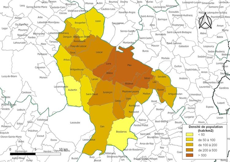 Les communes : Pau (80.400 habitants en 2023), Billère (14.384), Lons (13.606), Lescar (9.455), Jurançon (7.040), Gan (5.676), Idron (5.340), Bizanos (4.592), Gelos (3.637), Artiguelouve (2.045), Poey-de-Lescar (1.876), Mazères-Lezons (1.845), Denguin (1.765), Ousse (1.672), Uzein (1.326), Lée (1.271), Arbus (1.226), Sendets (1.167), Artigueloutan (1.105), Laroin (1.030), Bosdarros (962), Meillon (957), Bougarber (889), Aressy (881), Rontignon (875), Uzos (874), Aussevielle (864), Siros (848), Saint Faust (738), Aubertin (671), Beyrie-en-Béarn (197).