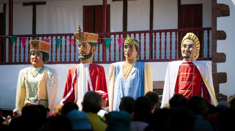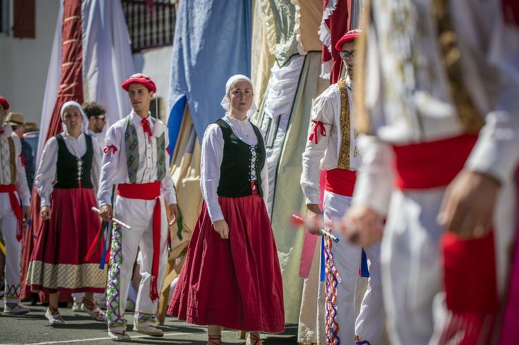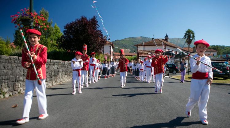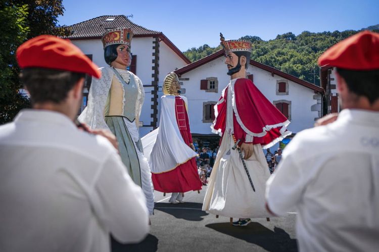 Puis, à mesure que la matinée avance, le village se transforme en scène à ciel ouvert. À 11 heures, le défilé s’élance, serpentant de Behereko à Gaineko Plaza. Danseurs et musiciens investissent les rues, accompagnés par les sonorités du txistu, de la gaita ou du trikitixa. Les géants, fidèles au rendez-vous, dominent la foule et rappellent que, ici, la tradition a parfois des allures démesurées.