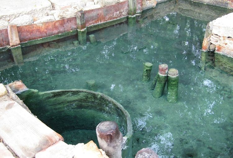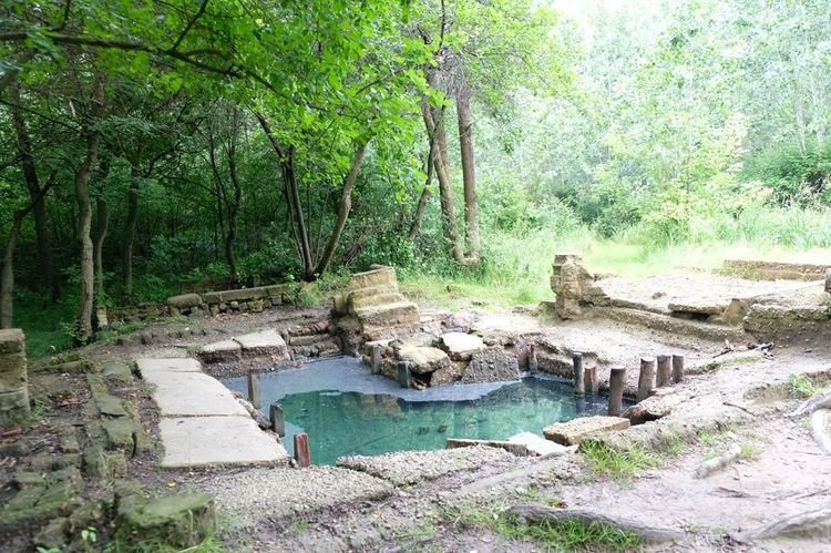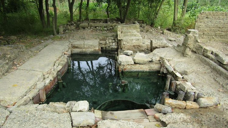 Intérêt : vestiges de l’ancien établissement thermal (bassin maçonné, tuiles, fondations visibles).