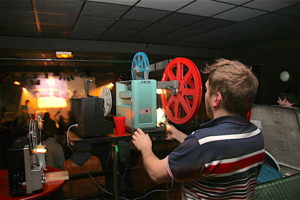 Rapidement après les débuts, les deux compères passent leur CAP de projectionniste. La collection s’étoffe de plus belle : La rose pourpre du Caire, Terminator, Star Wars, Les dents de la mer, Allien, sont quelques-uns des monuments que Les Projectivers passent dans les appartements de copains, sans la moindre assistance numérique. En bruit de fond, le souffle et les cliquetis du projecteur.